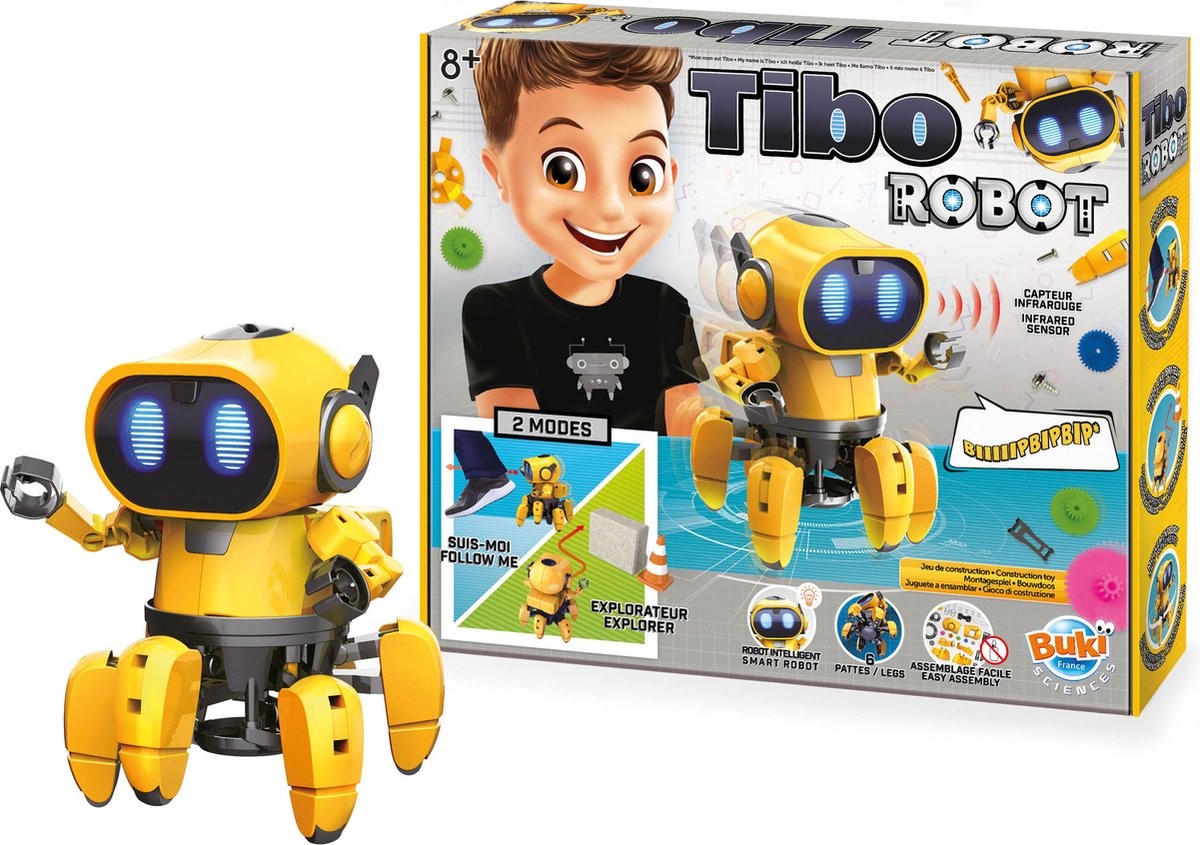 Zet Tibo de robot in elkaar en ontdek al zijn fantastische functies. Zo zit een volgmodus in de robot dat ervoor zorgt dat de robot dankzij sensoren het kind volgt. Daarnaast kan de robot ook obstakels vermijden.