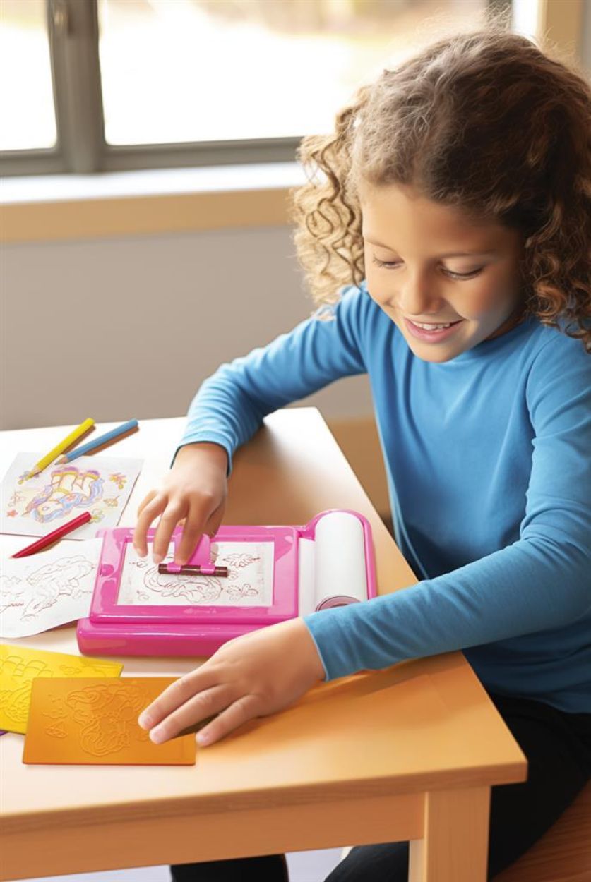 Inclusief: 8 verschillende eenhoornsjablonen om de scènes te maken, 2 krijtjes, krijthouder en 3 kleurpotloden. Bevat ook een handige draagtas om op te bergen.