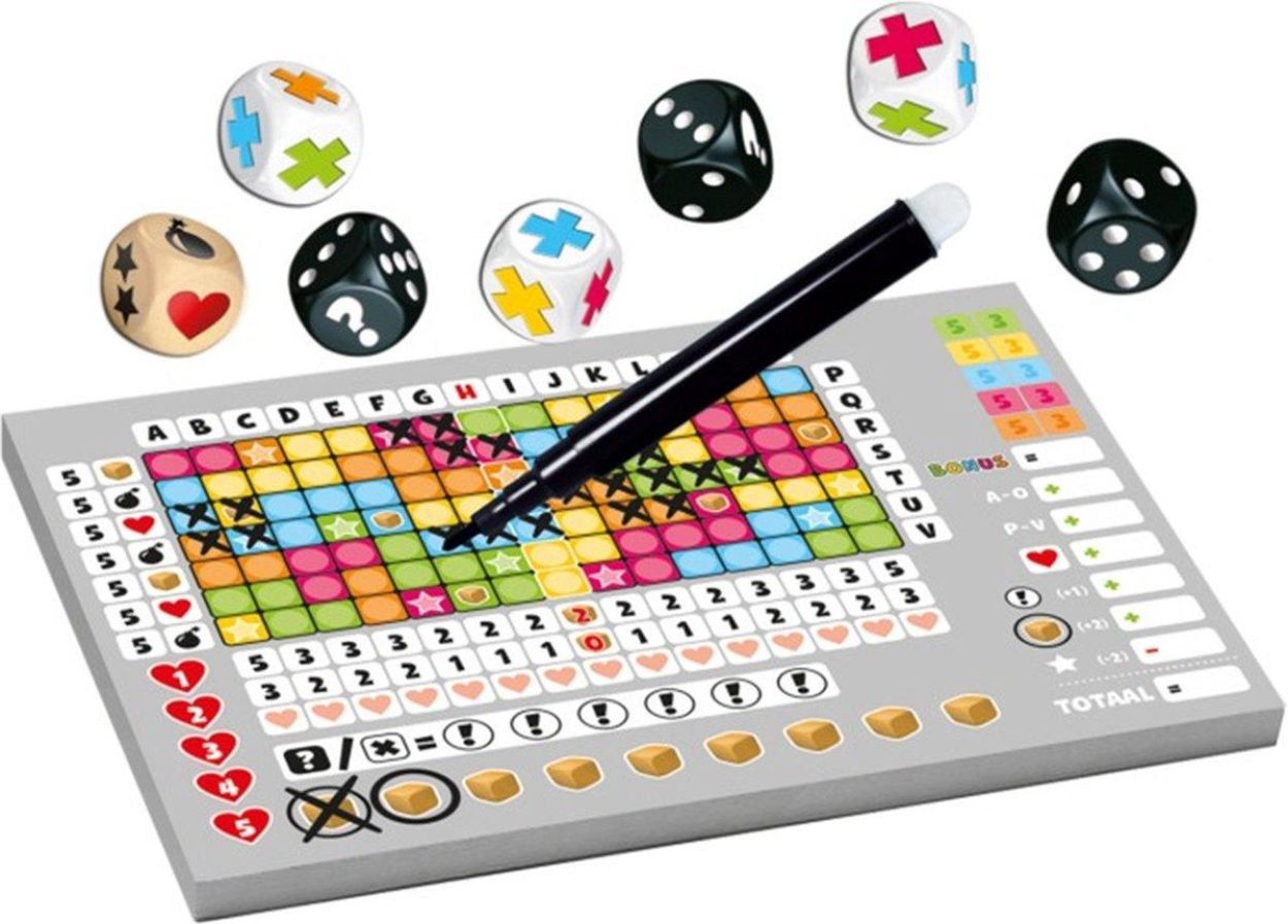 Dobbel- en puzzelspel voor het hele gezin. Kies steeds 2 dobbelstenen en kruis de bijbehorende vakjes op je speelveld aan. Het vullen van kolommen en gebieden van dezelfde kleur leveren...