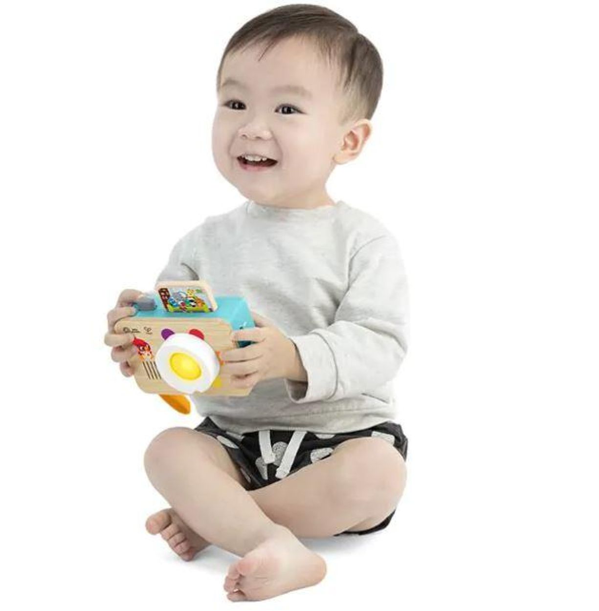 en het begrijpen van oorzaak en gevolg. Door aan de lens te draaien hoort je baby 6 kleurnamen in 4 talen (Engels, Spaans, Frans en Duits) en licht de lens op in bijpassende kleuren. Met meer dan 30 geluiden, zinnetjes en melodieën prikkelt deze duurzame camera de zintuigen en nodigt hij uit tot ontdekken en fantasiespel. Gemaakt van FSC-gecertificeerd hout, veilig en ideaal voor kleine handjes.
