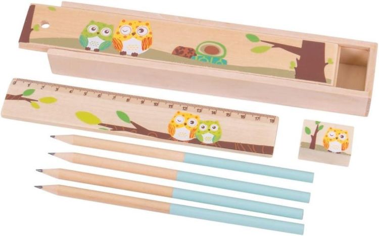 Schattige uilen houder voor potloden, slijper en meetlatje. Uitschuifbaar doosje waardoor jouw potloodjes netjes weg zitten. Afmetingen: 22 x 2,5 x 4,5 cm. Inclusief: houder, 4 potloden, slijper, meetlatje