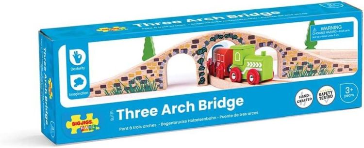 Mooie aanvulling op jouw houten treinset van Bigjigs. Rijd boven de brug of leg sporen onder de brug door. Ook daar kunnen treinen met gemak doorheen passeren.