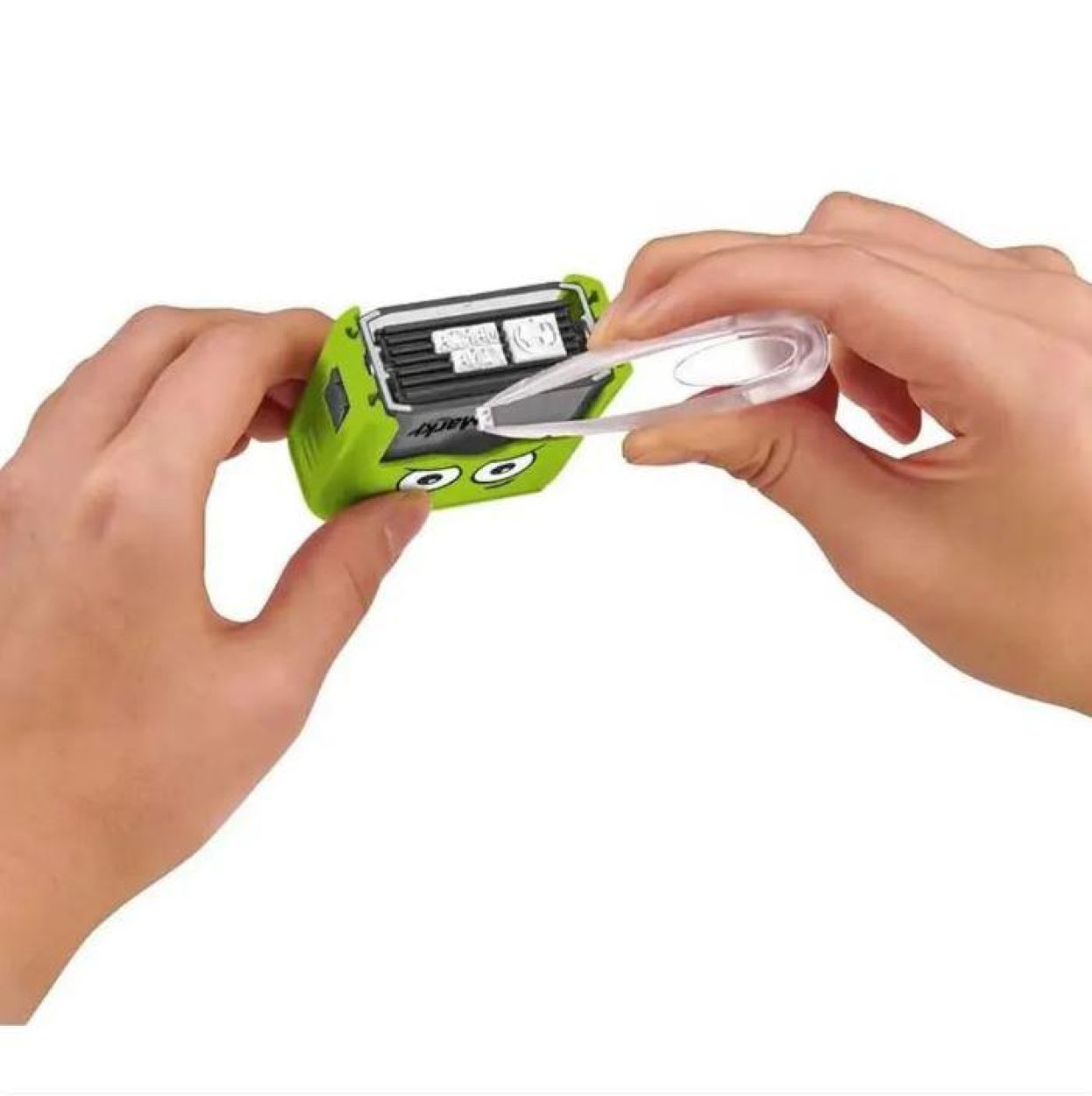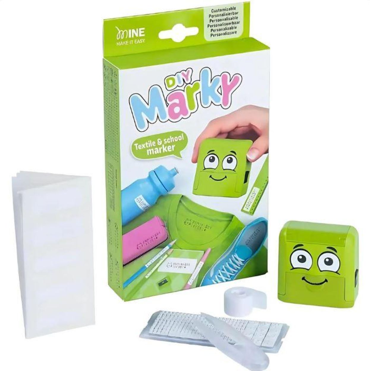naam eindeloos (perfect voor grote gezinnen). De zwarte inkt (tot 1000 afdrukken) is al in de stempel geladen en dematologisch getest. Met wasbare labels voor spullen en opstrijktape voor donkere stoffen kun je alles markeren wat je kleintje bezit: kleding, kicks, sportartikelen, schoolspullen, etui, rugzak, lunchbox, waterfles... Label alles onder de zon !