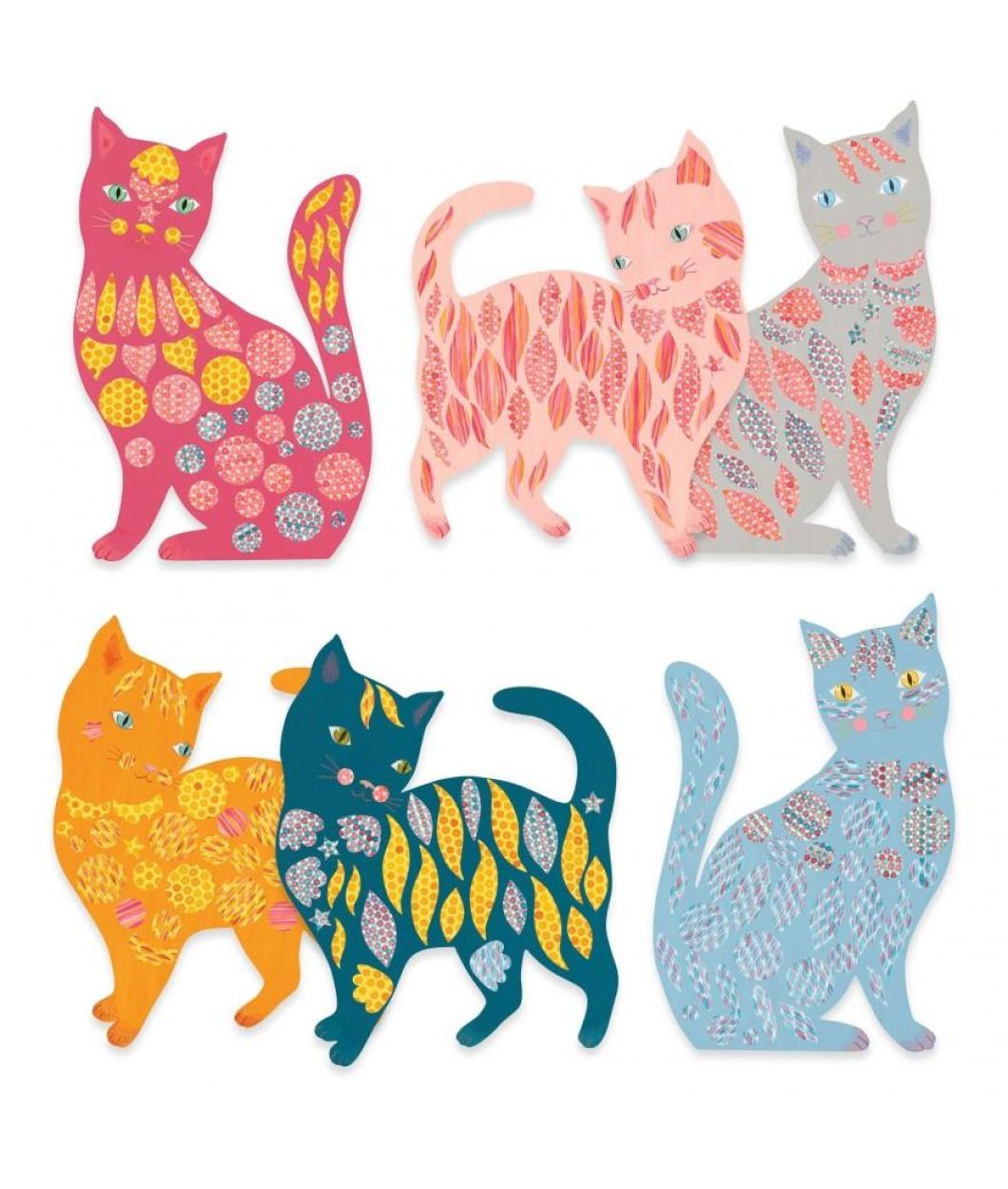 Knutselsetje van Djeco waarbij je 8 grote poezen met stickertjes kleurrijk gaat versieren.