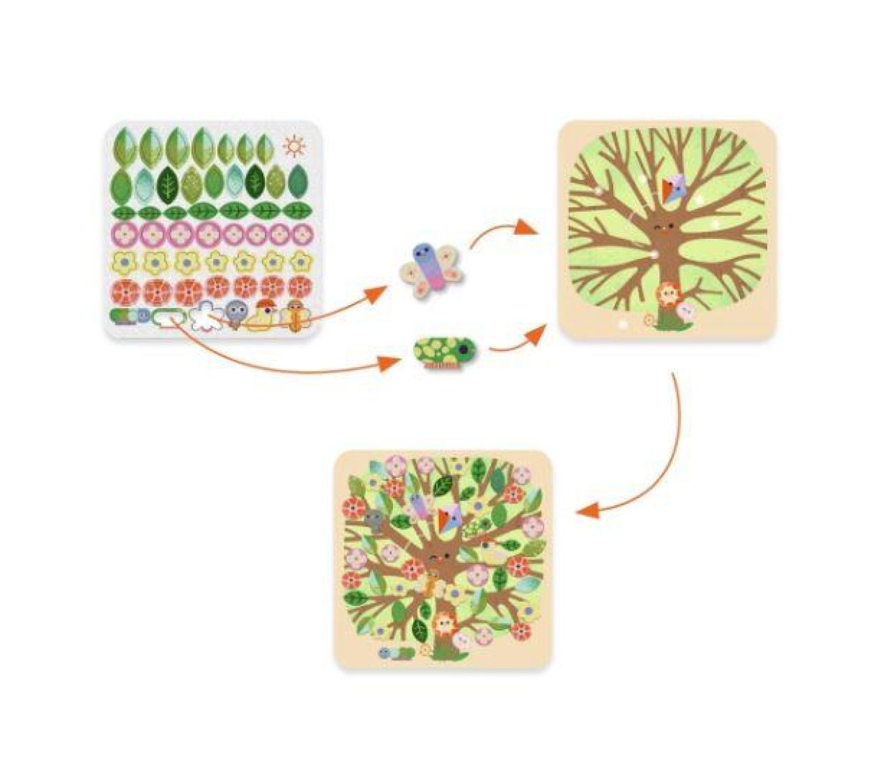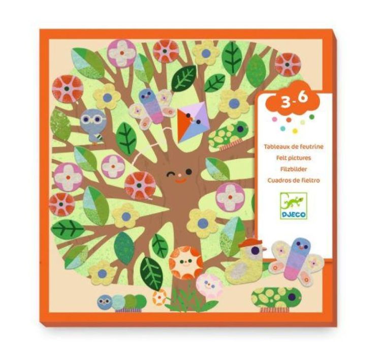 Een collage van zacht vilt voor kinderen vanaf 3 jaar om bomen tot leven te brengen naargelang het seizoen.
