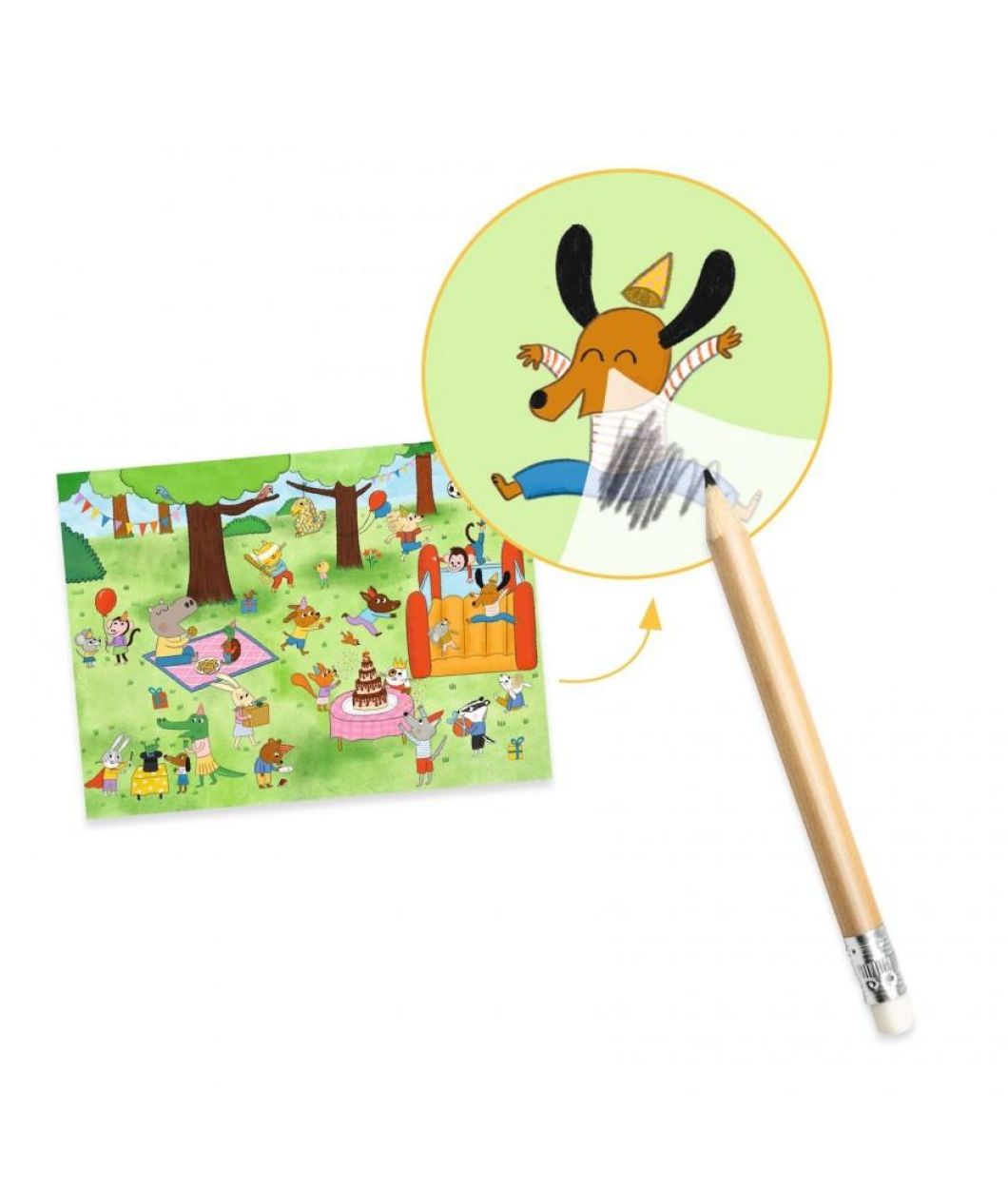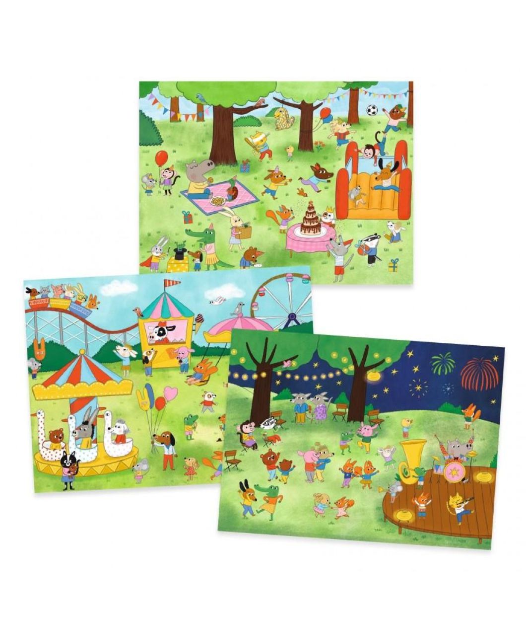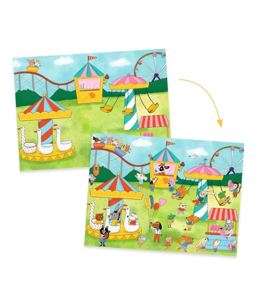 Een mapje van Djeco met een heleboel transferstickers en 3 grote geïllustreerde platen over het thema feest. Verjaardagsfeest, kermis of volksfeest: de kinderen kiezen een decor en leggen er de...