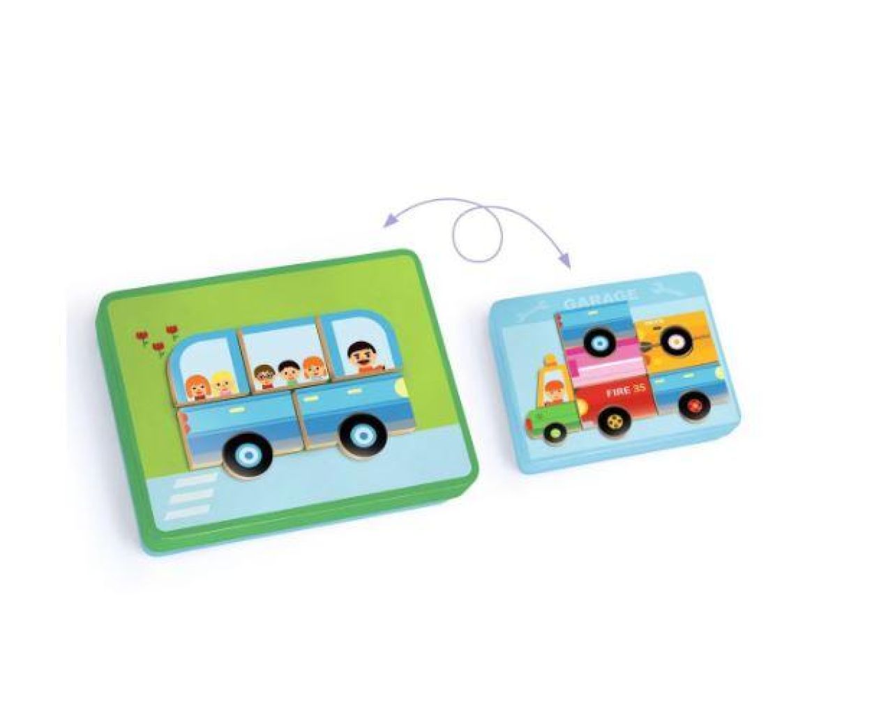 De set bevat een stevige, prachtig geïllustreerde metalen doos die aan beide kanten als basis dient. Met de 36 houten magnetische stukken kunnen kinderen de 12 voertuigen van de voorbeeldkaarten nabouwen, of hun eigen fantasievoertuigen ontwerpen. Van een brandweerauto tot een vrolijke takelwagen: de mogelijkheden zijn eindeloos.