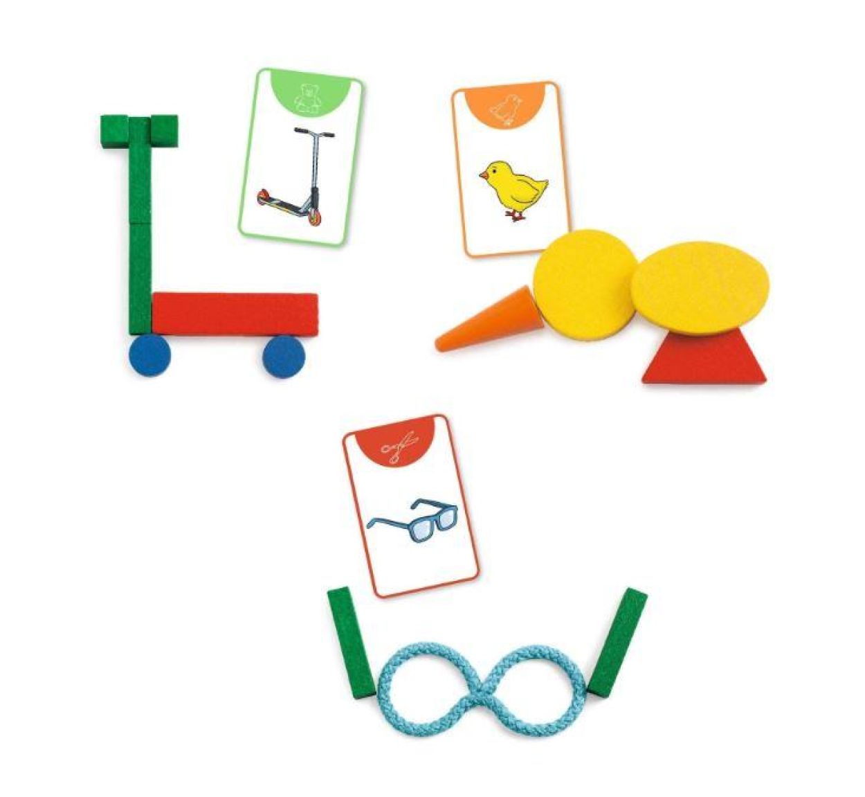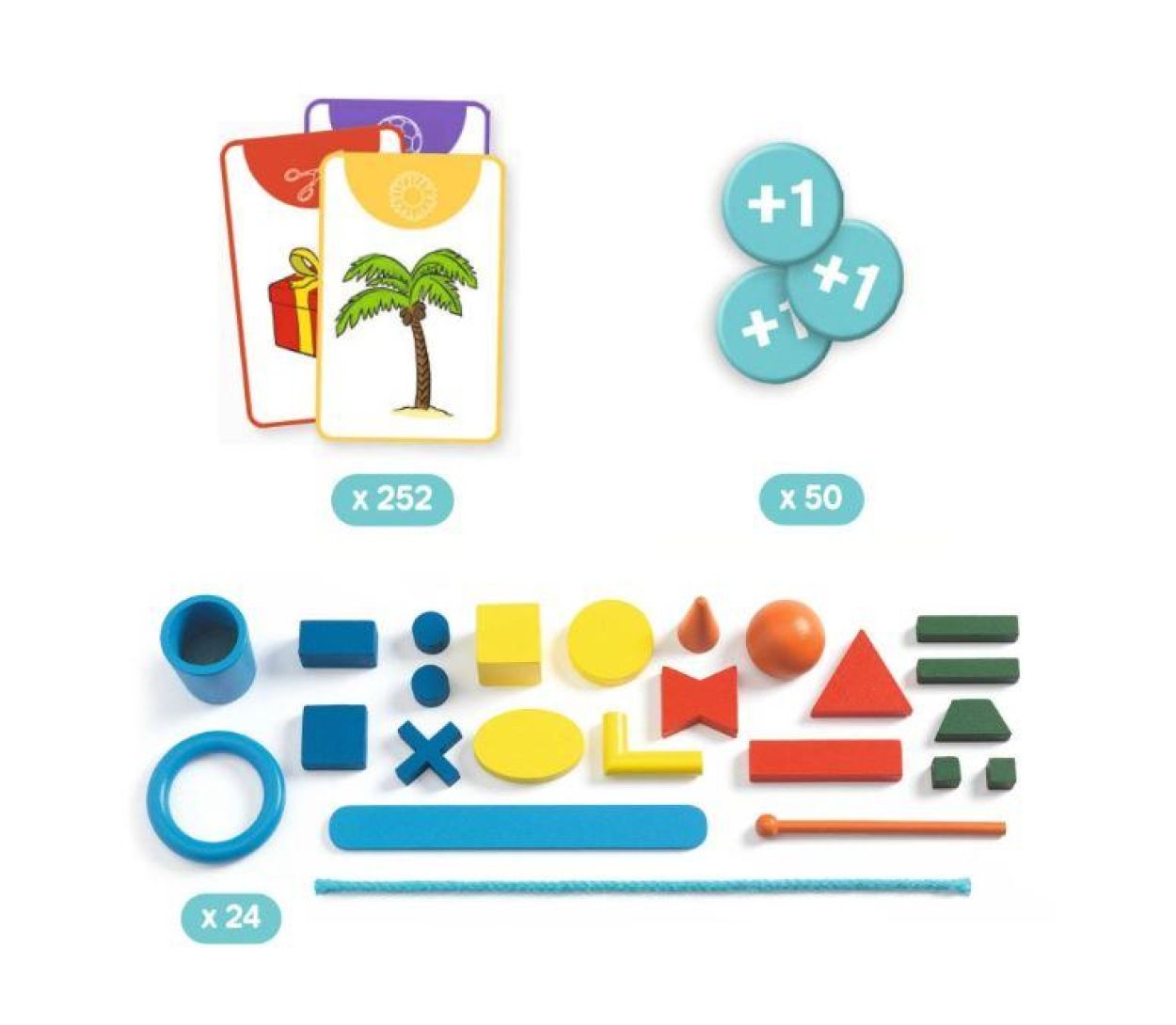 Inclusief: 21 houten vormen + 1 touwtje + 240 geïllustreerde kaarten + 12 blanco kaarten + 50 overwinningsfiches + 1 spelregelboekje.