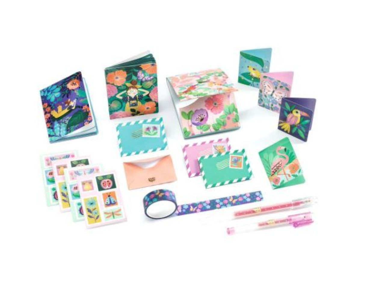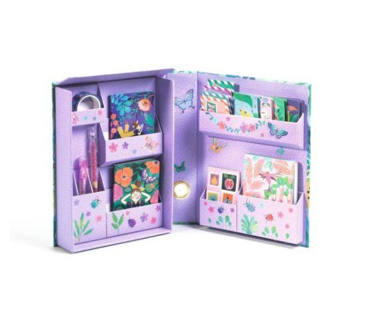 Wanneer je het “boek” opent, ontvouwt zich een charmante wereld vol schrijfwaren en accessoires. In de verschillende vakjes vind je alles wat je nodig hebt om te schrijven, tekenen, versieren of een persoonlijke brief te maken.