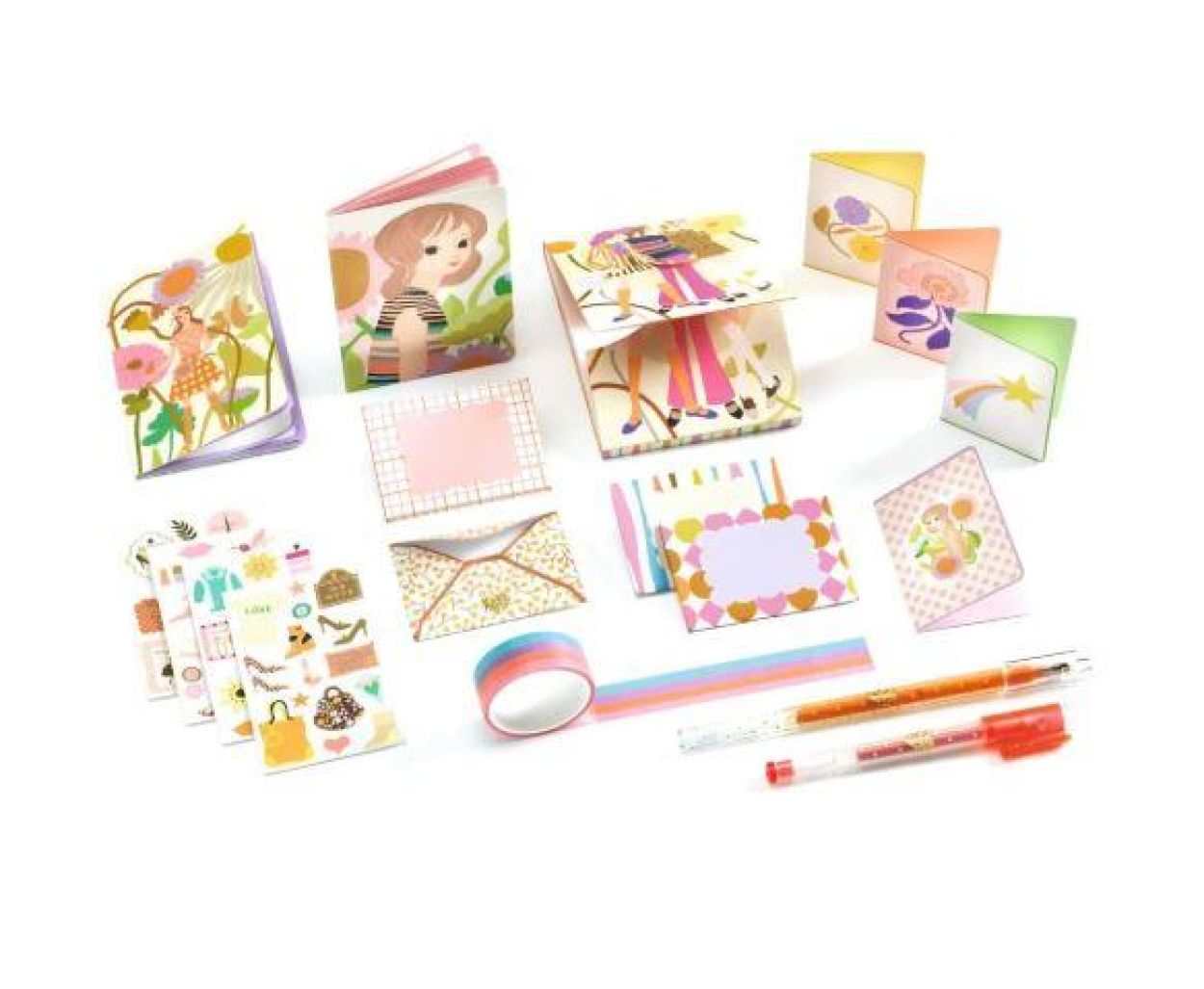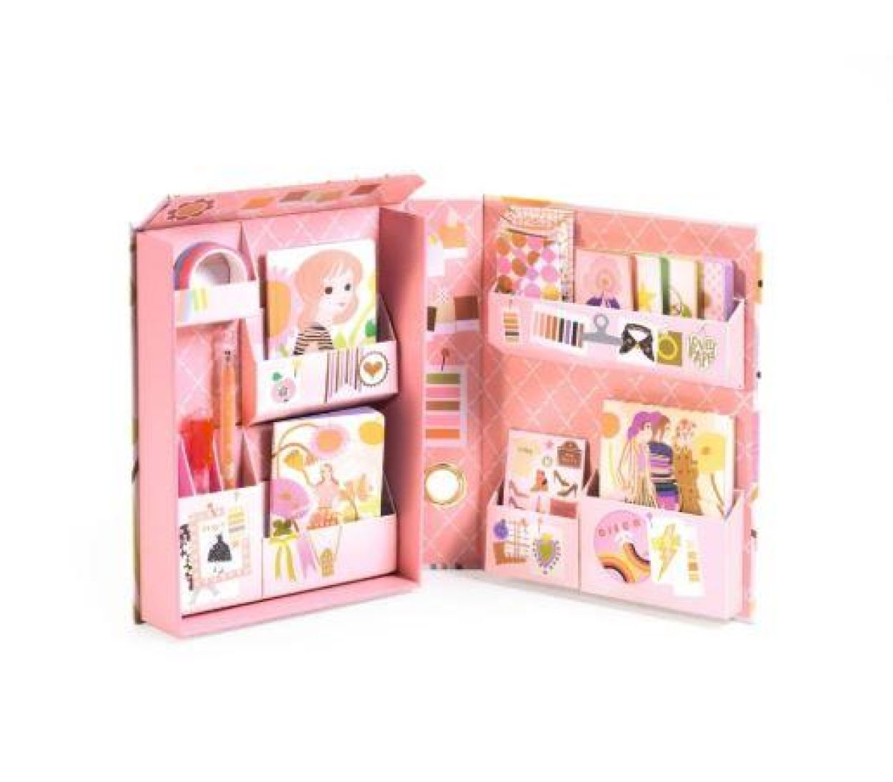 Wanneer je het “boek” opent, ontvouwt zich een charmante wereld vol schrijfwaren en accessoires. In de verschillende vakjes vind je alles wat je nodig hebt om te schrijven, tekenen, versieren of een persoonlijke brief te maken.