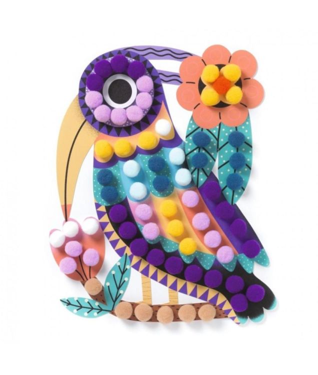 Een plakactiviteit voor peuters en kleuters om de 3 vogels te versieren met pomponnetjes. Het kind plakt de gekleurde pompons op de zelfklevende delen van de 3 silhouetplaten volgens de...