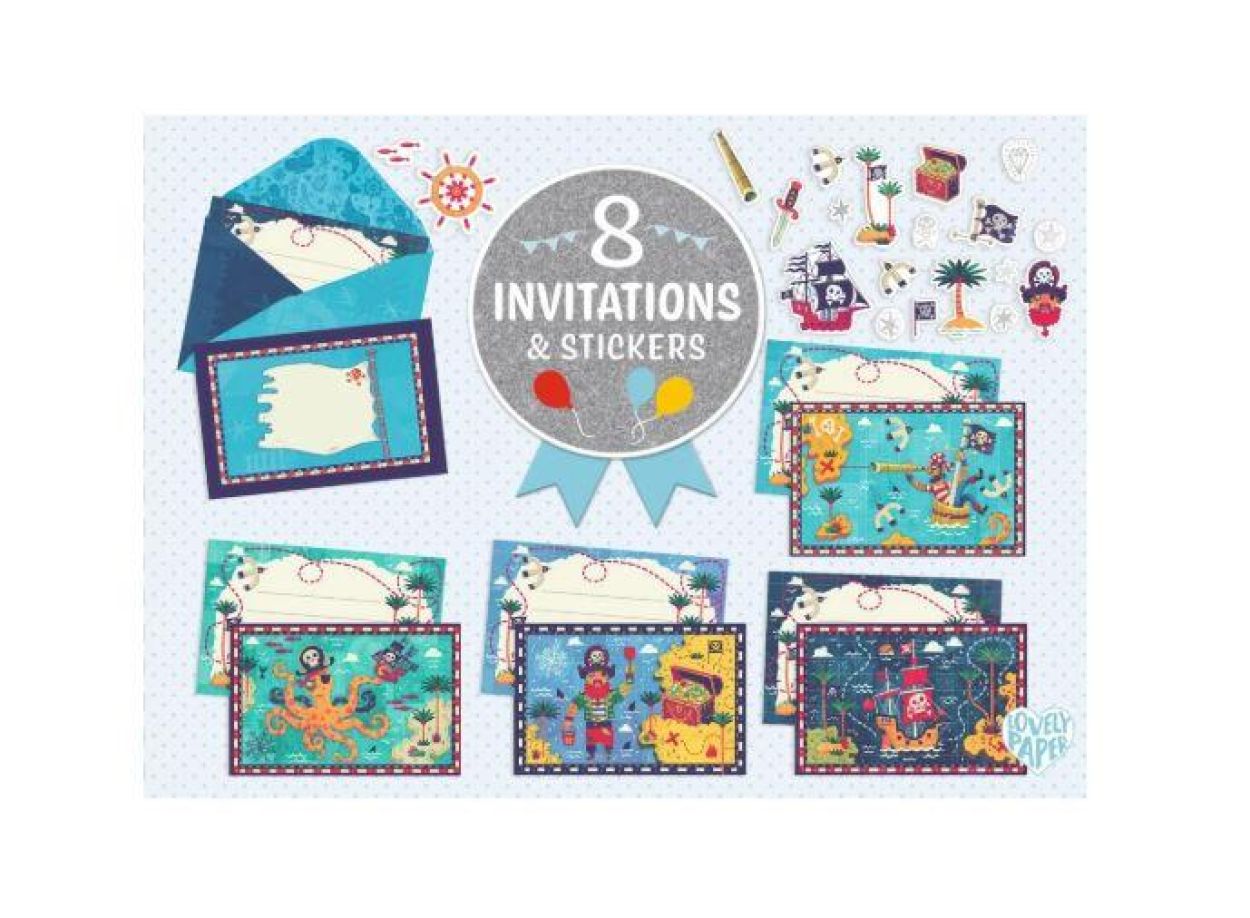 Deze set met als thema piraten bevat 8 geïllustreerde uitnodigingskaarten, 8 bijpassende enveloppen en 2 stickervellen om elk bericht te personaliseren.