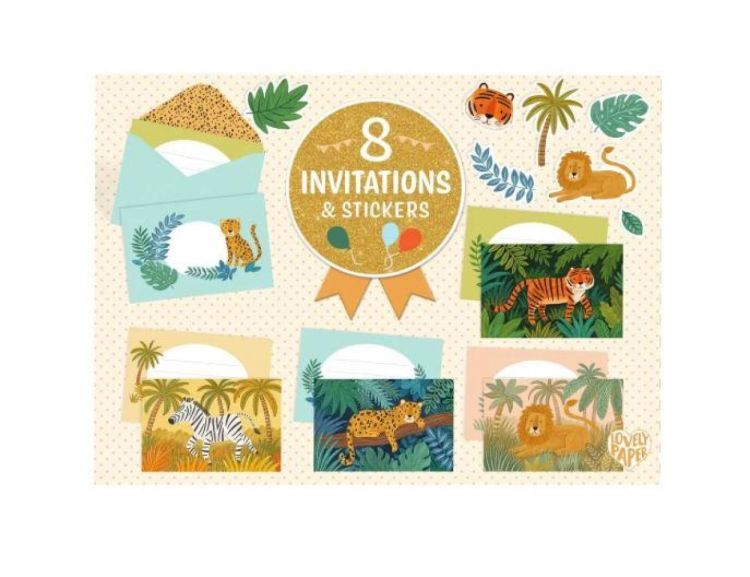 Deze set met als thema jungle bevat 8 geïllustreerde uitnodigingskaarten, 8 bijpassende enveloppen en 2 stickervellen om elk bericht te personaliseren.