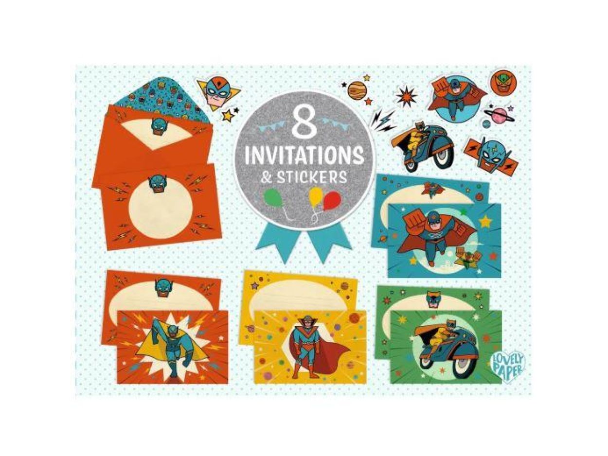 Deze set met als thema superhelden bevat 8 geïllustreerde uitnodigingskaarten, 8 bijpassende enveloppen en 2 stickervellen om elk bericht te personaliseren.
