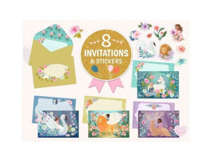 Deze set met als thema fantasiedieren bevat 8 geïllustreerde uitnodigingskaarten, 8 bijpassende enveloppen en 2 stickervellen om elk bericht te personaliseren.