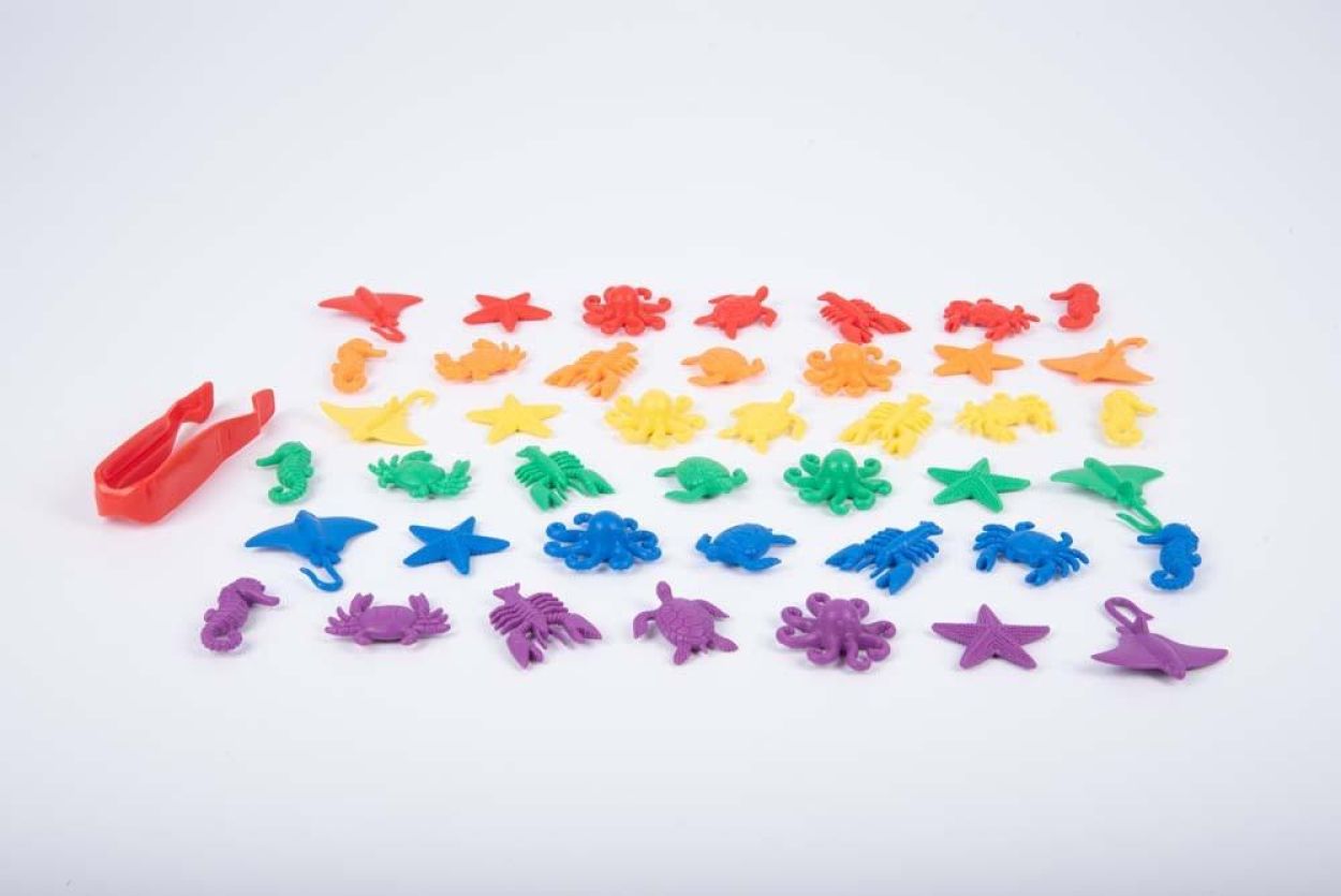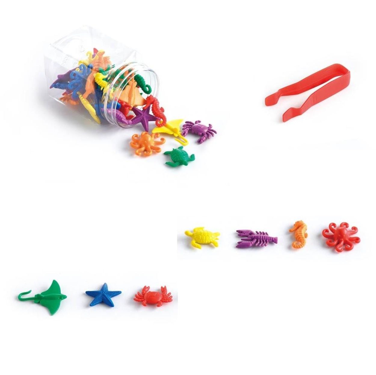 Setje van 42 kleurrijke waterdierfiguurtjes om te sorteren, tellen, ... allerhande rekenactiviteiten in de kleuterklas. Inclusief: 42 figuurtjes in 7 varianten, 6 kleuren. Pincetje. Afmetingen: ongeveer 5 cm