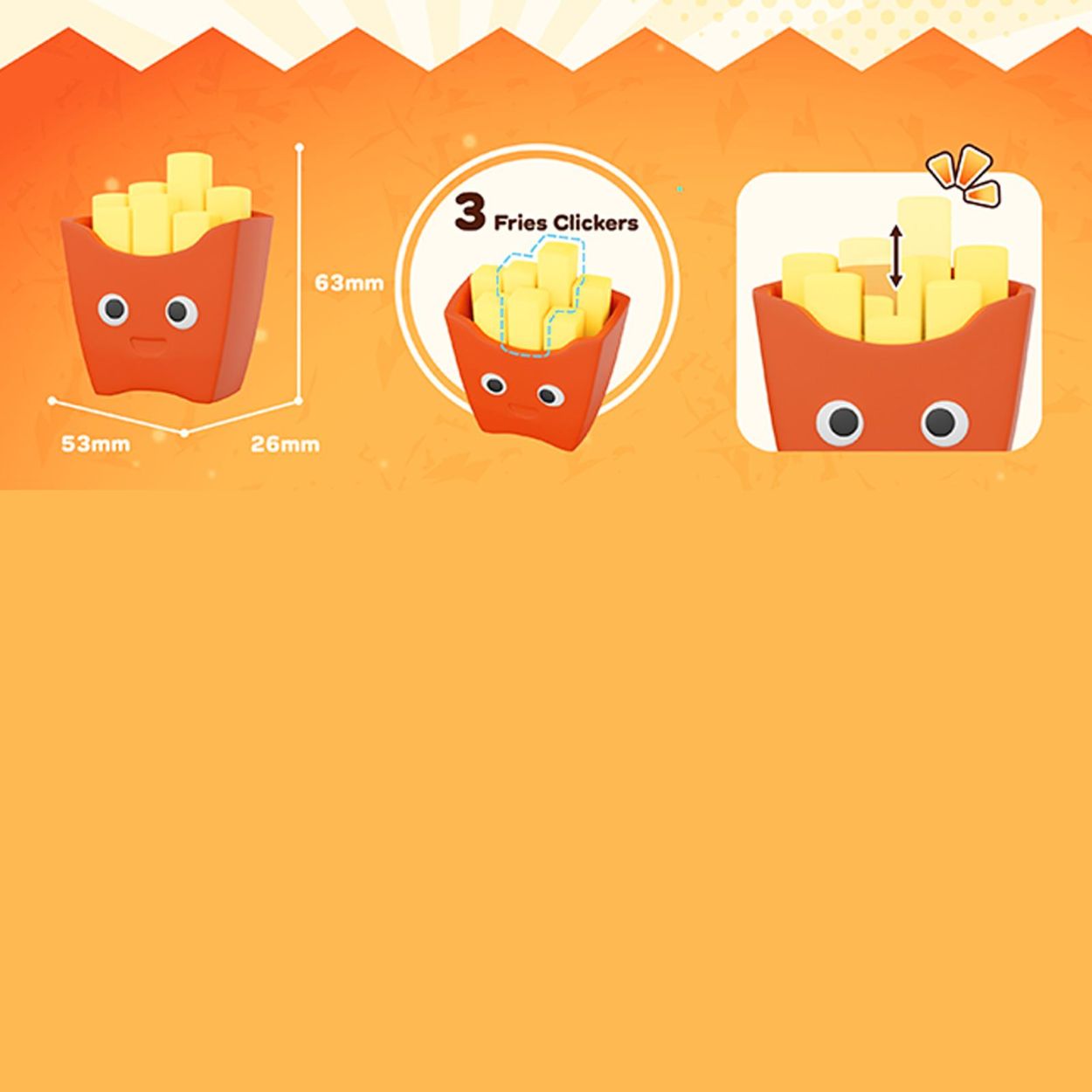 Eindeloos draaien en klikken met deze vrolijke handzame Fidgets. Frietklikker, klik op en neer met geluid. Vanaf 3 jaar. Afmetingen: 2,6 x 5,3 x 6,3 cm.