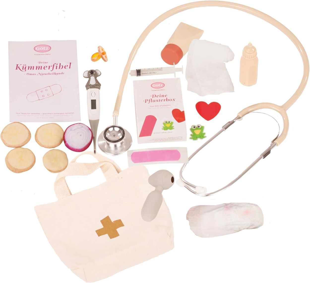 Het dokterspeelsetje bevat alles voor een realistische check-up: stethoscoop, thermometer, reflexhamer, otoscoop, injectiespuit, verband, pleisters en zelfs natuurlijke ‘remedies’ van textile ui en gember. Kinderen leren op een speelse manier voor hun pop te zorgen, van koorts meten tot kleine wondjes verzorgen.
