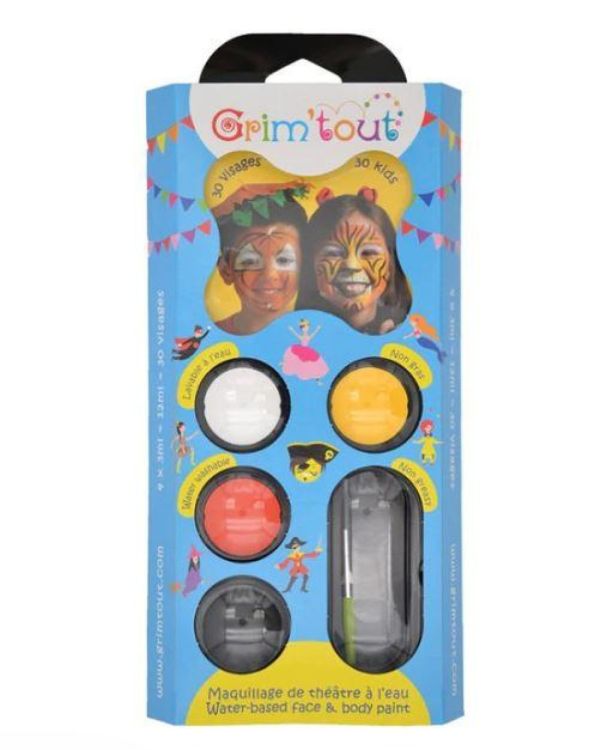 Laat kinderen schitteren op ieder feest met de Grim Tout schminkset 4 kleuren: tijger en pompoen! Deze vrolijke face-paint set bevat vier water-based kleuren (wit, geel, oranje en zwart) waarmee...