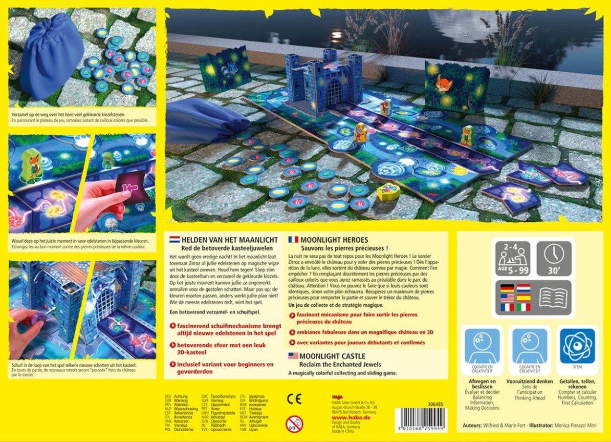 Betreed een magische wereld vol spanning en avontuur met Haba Helden van het Maanlicht, het prachtig vormgegeven familiespel waarin spelers slim tegen elkaar strijden om zoveel mogelijk edelstenen te redden....
