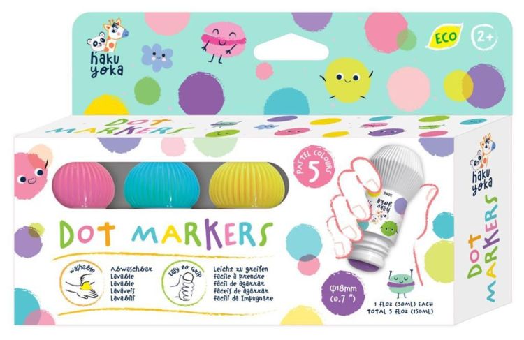 Haku Yoka verstiften waarmee het kind makkelijk stippen kan verven. De dikke stiften liggen makkelijk in de hand en de verf zelf is afwasbaar.