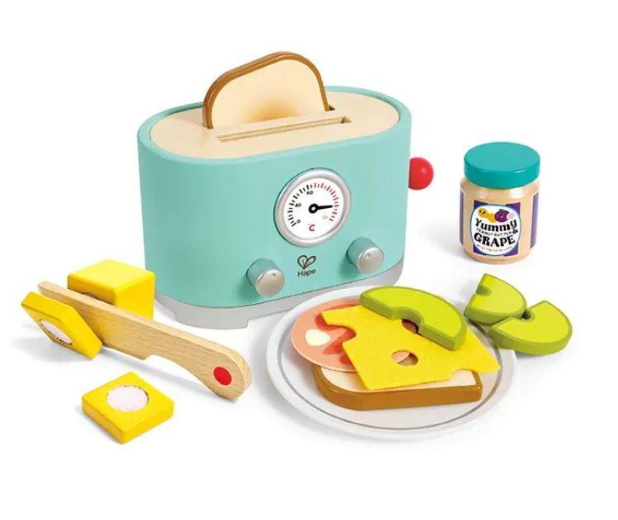 Inclusief: 1 broodrooster, 2 sneetjes brood, 1 bosbessen jam, 1 boter (3 delen), 1 mes, 3 avocado schijfjes, 1 plakje kaas, 1 plakje ham & 1 bord.