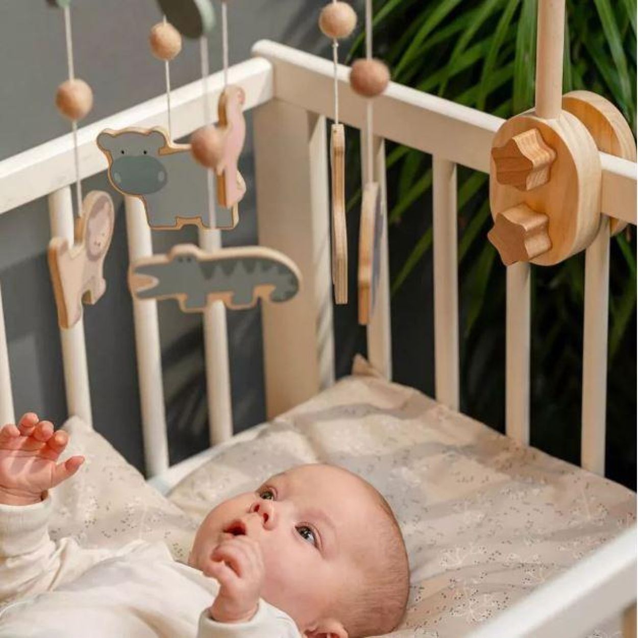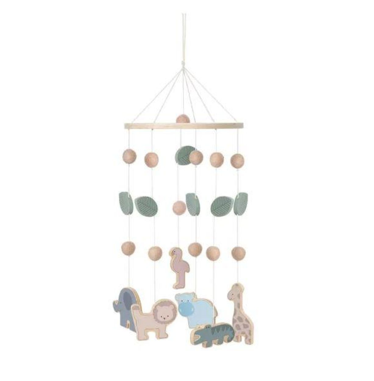 Breng een vleugje avontuur in de babykamer met de houten mobiel van Jabadabado! Deze prachtige houten mobiel met schattige safaridieren, zoals een leeuw, olifant en giraf, creëert een rustgevende en...