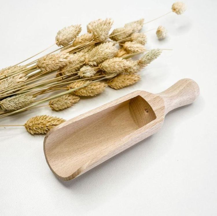 Gebruik dit leuke schepje om in het zand en/of rijst te scheppen. Materiaal: Beukenhout Afmeting: 9 cm