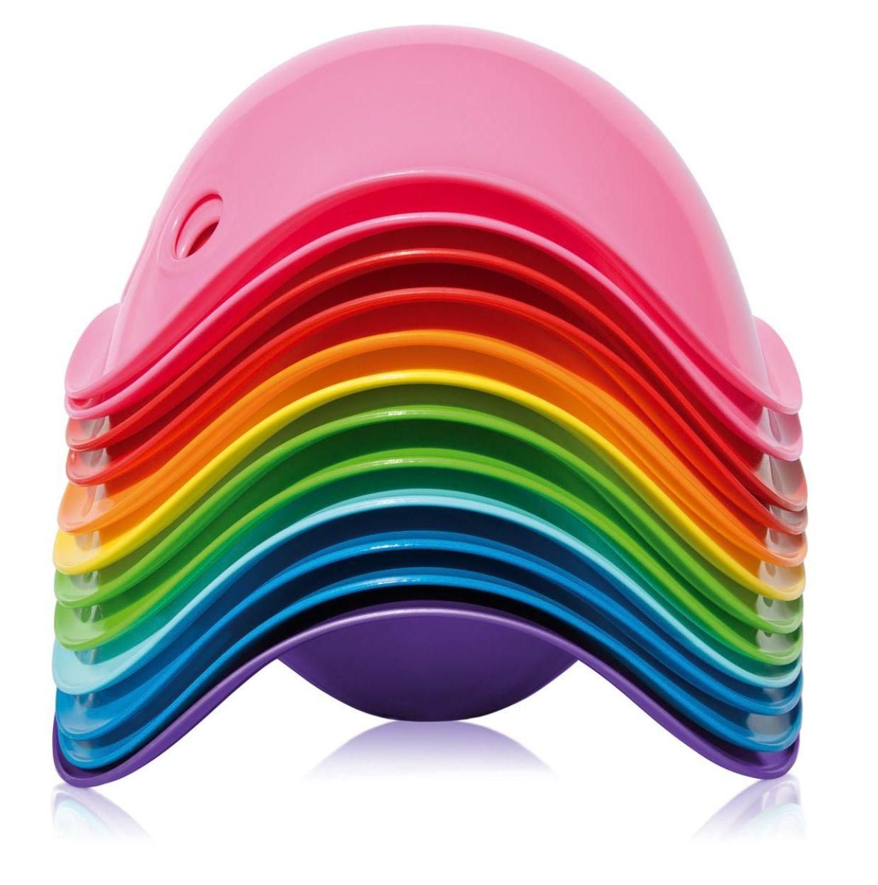 x gaten vooraan. In de handen van kinderen verandert deze schelp in een poppenbed, een schat, een schaal voor sneeuwballen, een tunnel voor treintjes, een boot in bad, een helm, een opstapje, ... . Kinderen kunnen ermee glijden, rollen, springen, draaien en nog zoveel meer.