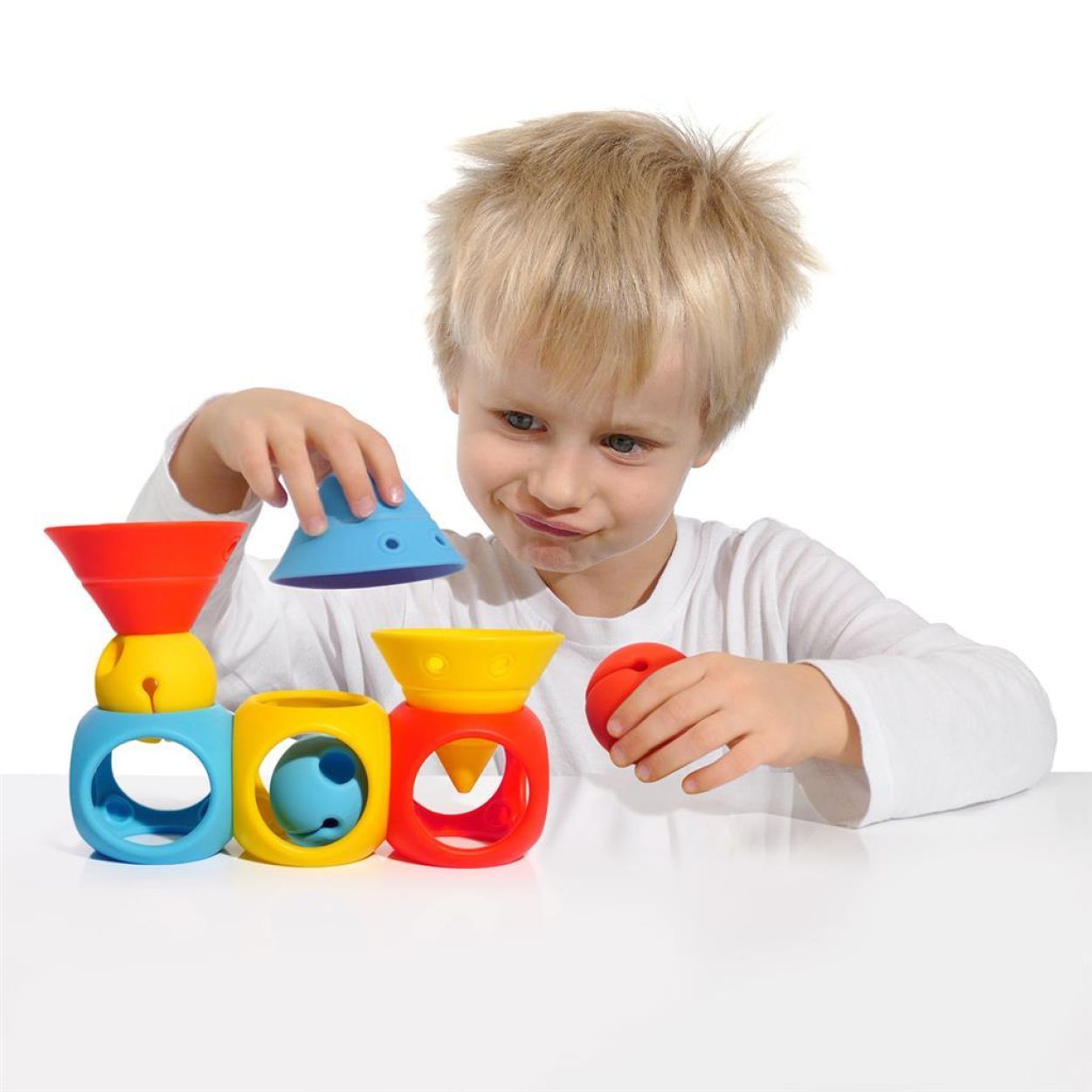 3 babyspeeltjes, een schat aan speelmogelijkheden voor de allerkleinsten. Baby's gebruiken dit speelgoed als zintuiglijke stimulatie (bijten, voelen, kijken), peuters gaan op ontdekking en stapelen en bouwen.