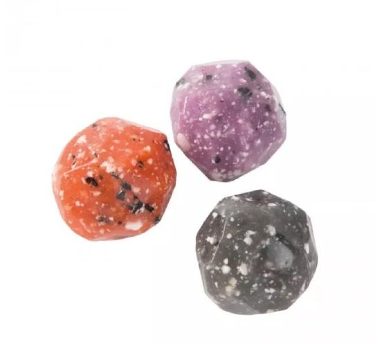 3 leuke stuiterballen in de vorm van kiezelstelen, of mineralen of kristallen. Omwille van de niet-ronde vorm botsen ze alle kanten op. Afmetingen botsbal: Ø 3 cm.