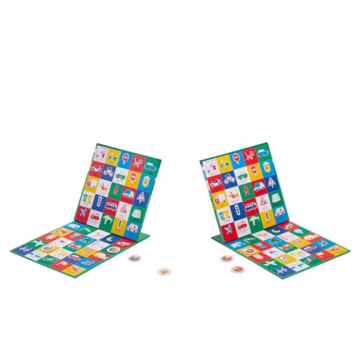 Magnetische autobingo voor onderweg. Wie ziet als eerste een rode auto of een luchtballon? Kan je een voorwerp vinden op jouw bordje, dan mag je er een schijfje op leggen....