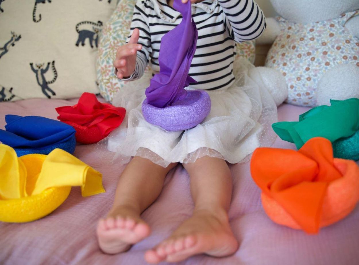 Combineren: De kleuren matchen perfect bij onze sensorische pittenzakjes en Stapelstein elementen.