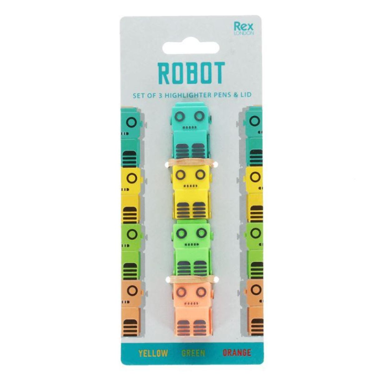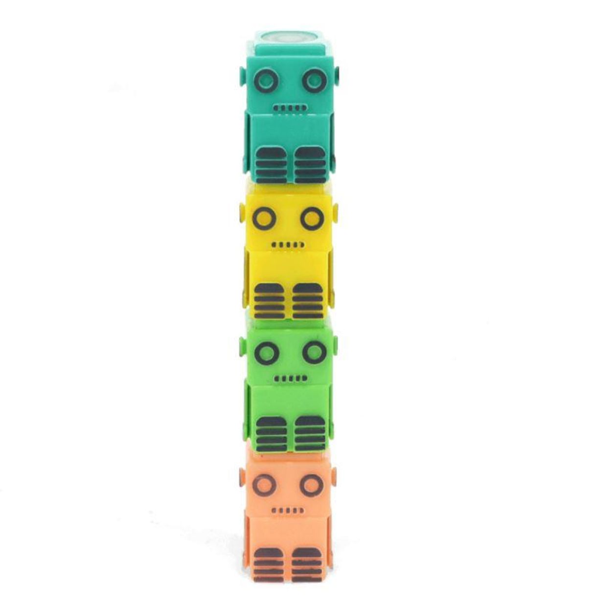 Super coole markeerstiftjes in de vorm van robots. De stiftjes worden bewaard door ze op elkaar te stapelen.