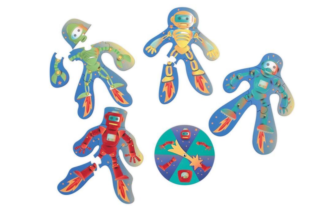 Wie maakt zijn/haar robot als eerste compleet? Draai aan het rad en vul de puzzel aan het het puzzelstuk dat de pijl aangeeft. Probeer telkens een ander onderdeel te draaien,...