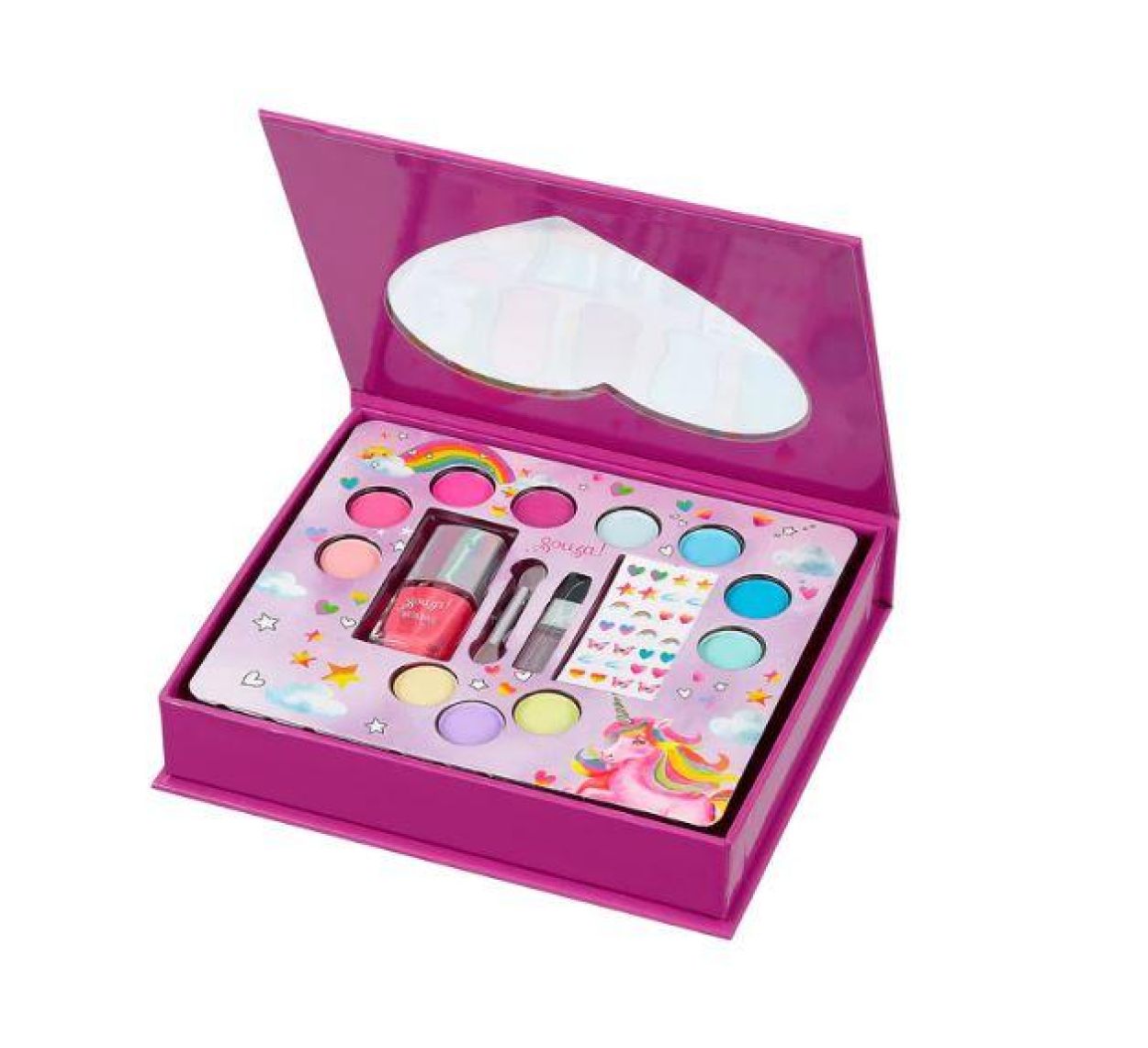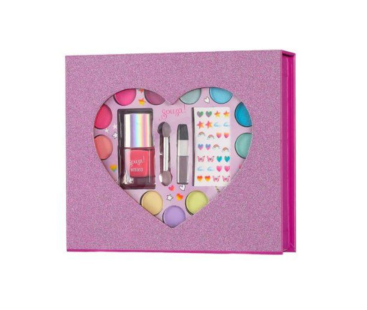 Cadeauset van Souza for Kids met 1 potje vegan nagellak op waterbasis. Inclusief nagelstickertjes en vele kleurtjes oogschaduw.
