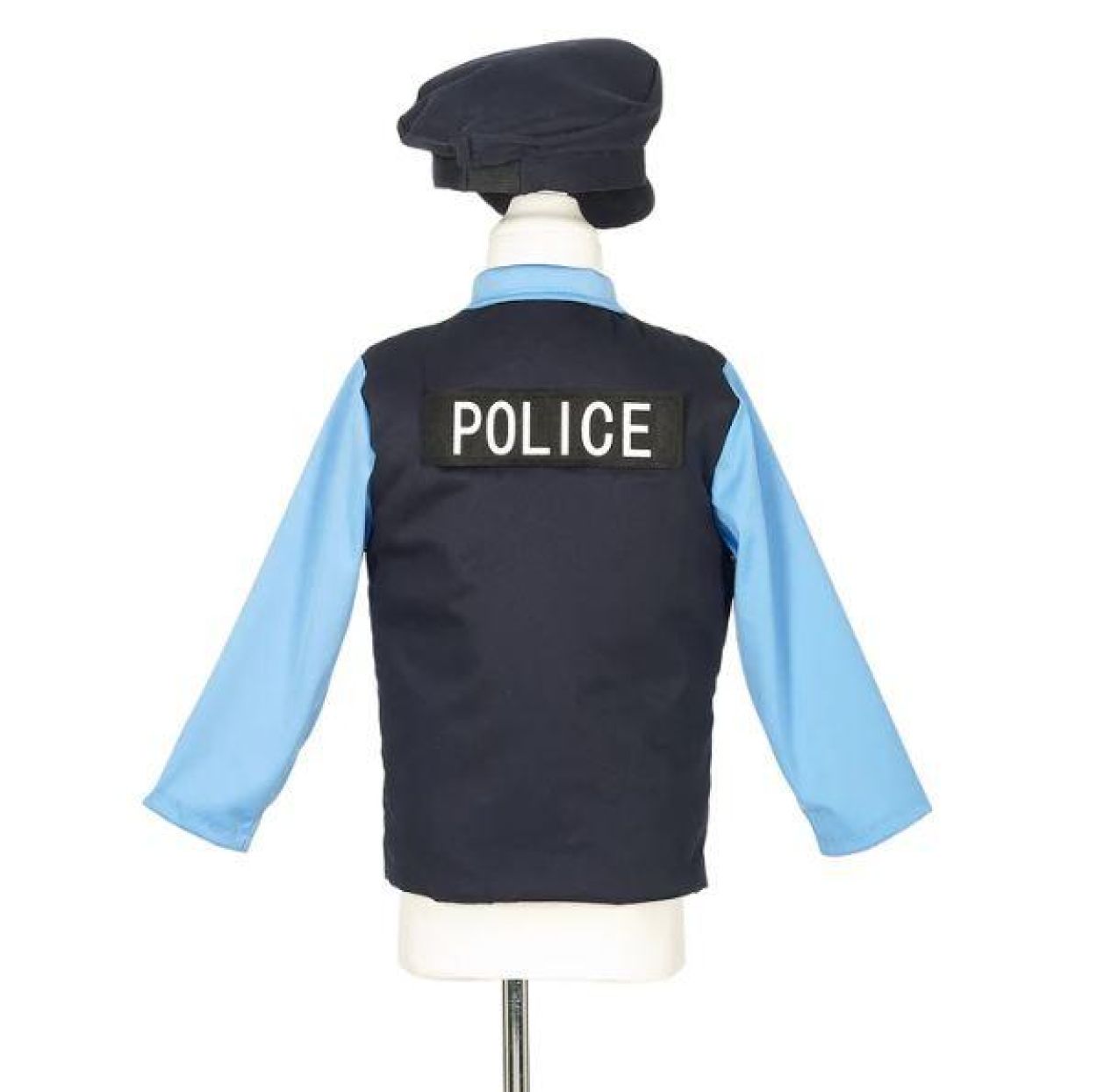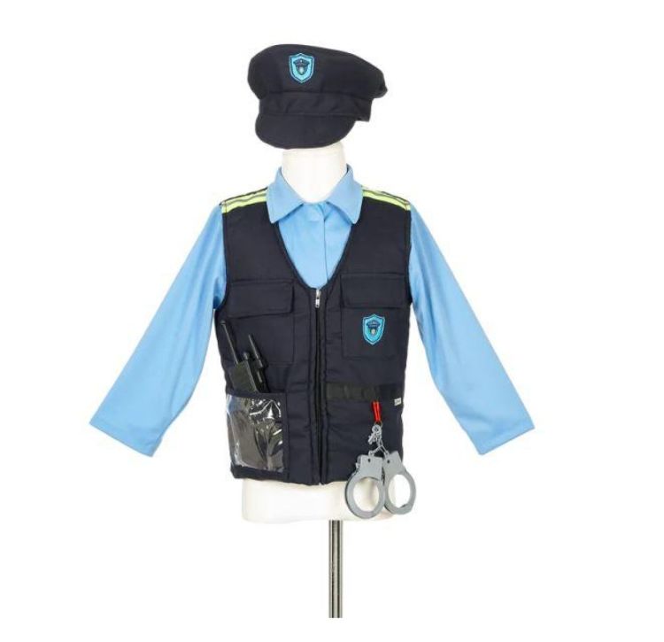 De verkleedset bestaat uit een politievest (lengte: 49 cm) en bijpassende hoed, gemaakt van 80% katoen en 20% polyester voor een comfortabele pasvorm en lange levensduur. De stevige afwerking zorgt ervoor dat het pak tegen een stootje kan, perfect voor energieke kids tussen de 4 en 7 jaar.