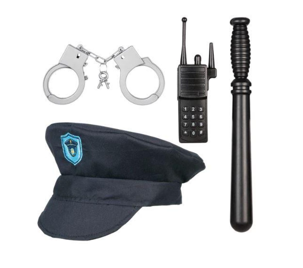 Inclusief: Politievest (met klittenband sluiting), Bijpassende politiehoed, Speelgoed handboeien, Speelgoed-portofoon, Politie wapenstok, 3 verwisselbare naamlabels ("POLICE") in het Engels, Spaans en Duits. makkelijk te bevestigen met klittenband.