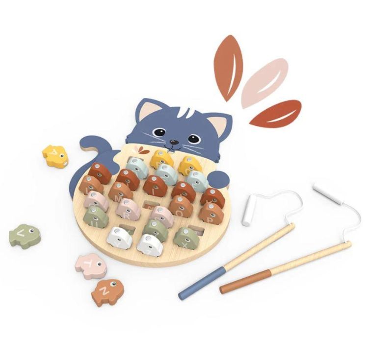 Met 26 vrolijk gekleurde houten visjes, elk voorzien van een duidelijke letter van het alfabet, kunnen kinderen letters herkennen, benoemen en sorteren. Dankzij de 2 magnetische hengels kunnen ze samen of alleen spelenderwijs "vissen" naar de juiste letters.