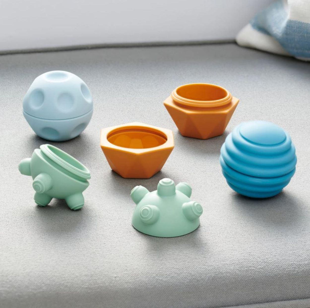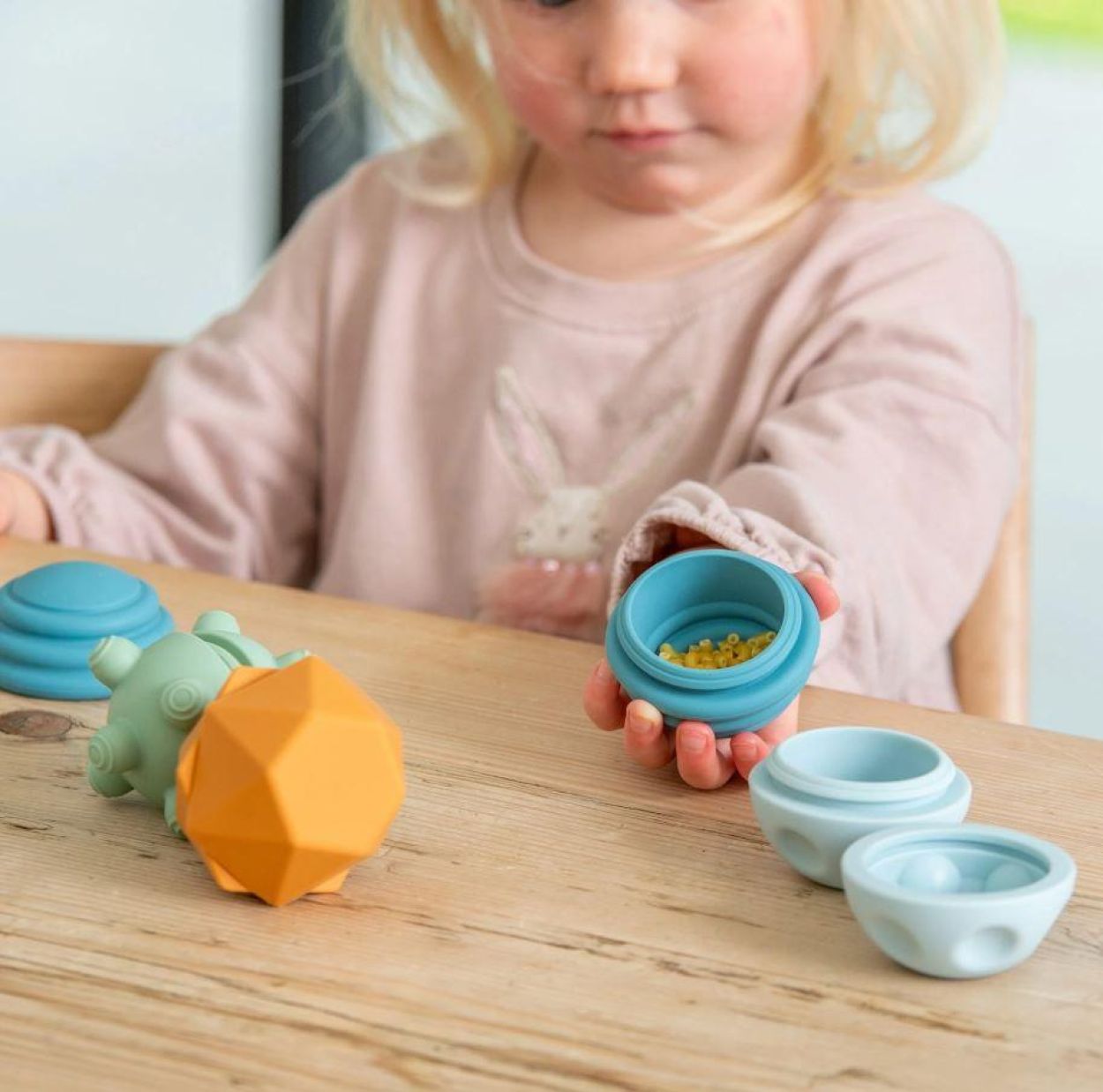 De ballen zijn niet alleen zacht en flexibel, maar hebben ook een uniek twist-to-open ontwerp: draai en de bal springt open, waardoor een holle binnenkant zichtbaar wordt. Vul deze met droge peulvruchten of kralen om je eigen sensorische rammelaars te maken! Zo voeg je eenvoudig een auditief element toe aan het spel, ideaal voor het ontdekken van geluiden, ritmes en oorzaak-gevolg.