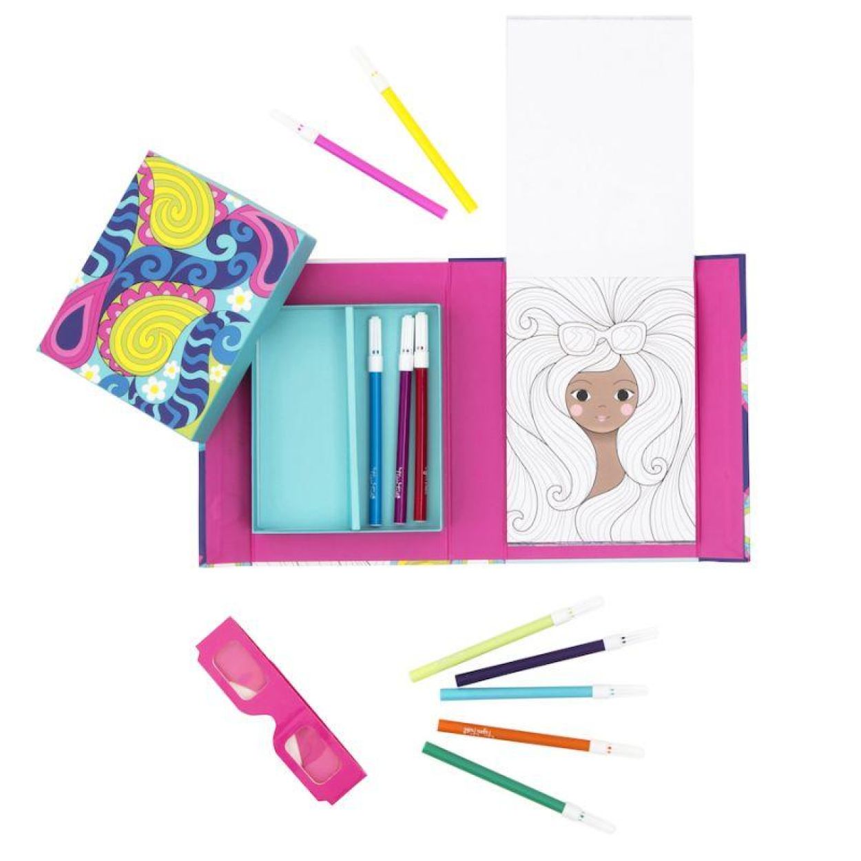 Inclusief: 36 kleurplaten, 10 viltstiften, 3D-bril, opbergdoosje.