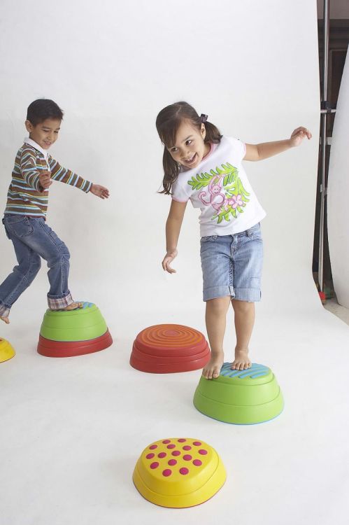 Springen van steen tot steen. Stimuleer met deze stenen de motoriek, het evenwicht, coördinatiegevoel en behendigheid van de kinderen.